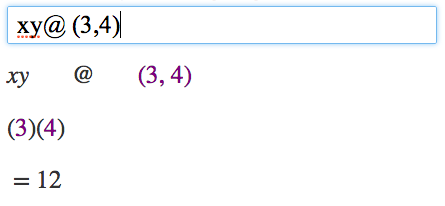 Algebra Calculator can also evaluate expressions that contain variables x and y. To evaluate an expression containing x and y, enter the expression you want to evaluate, followed by the @ sign and an ordered pair containing your x-value and y-value. Here is an example evaluating the expression xy at the point (3,4): xy @ (3,4).