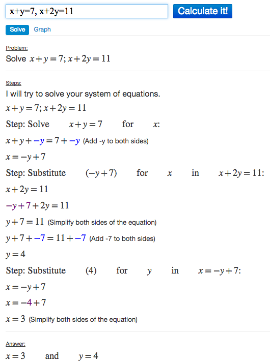 x+y=7, x+2y=11How to Solve the System of Equations in Algebra Calculator