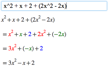 Here are some examples: x^2 + x + 2 + (2x^2 - 2x), (x+3)^2.