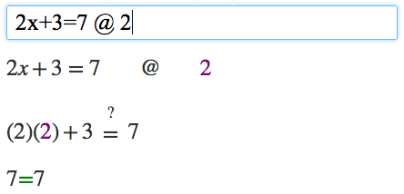 As an example, suppose we solved 2x+3=7 and got x=2. If we want to plug 2 back into the original equation to check our work, we can do so: 2x+3=7 @ 2. Since the answer is right, Algebra Calculator shows a green equals sign.