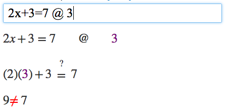 If we instead try a value that doesn't work, say x=3 (try 2x+3=7 @ 3), Algebra Calculator shows a red "not equals" sign instead.