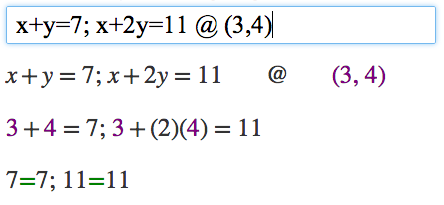 To check an answer to a system of equations containing x and y, enter the two equations separated by a semicolon, followed by the @ sign and an ordered pair containing your x-value and y-value. Example: x+y=7; x+2y=11 @ (3,4).